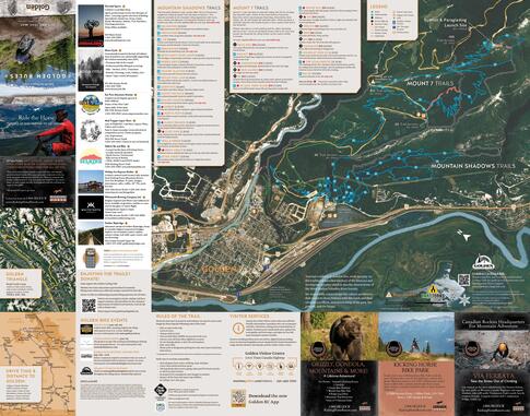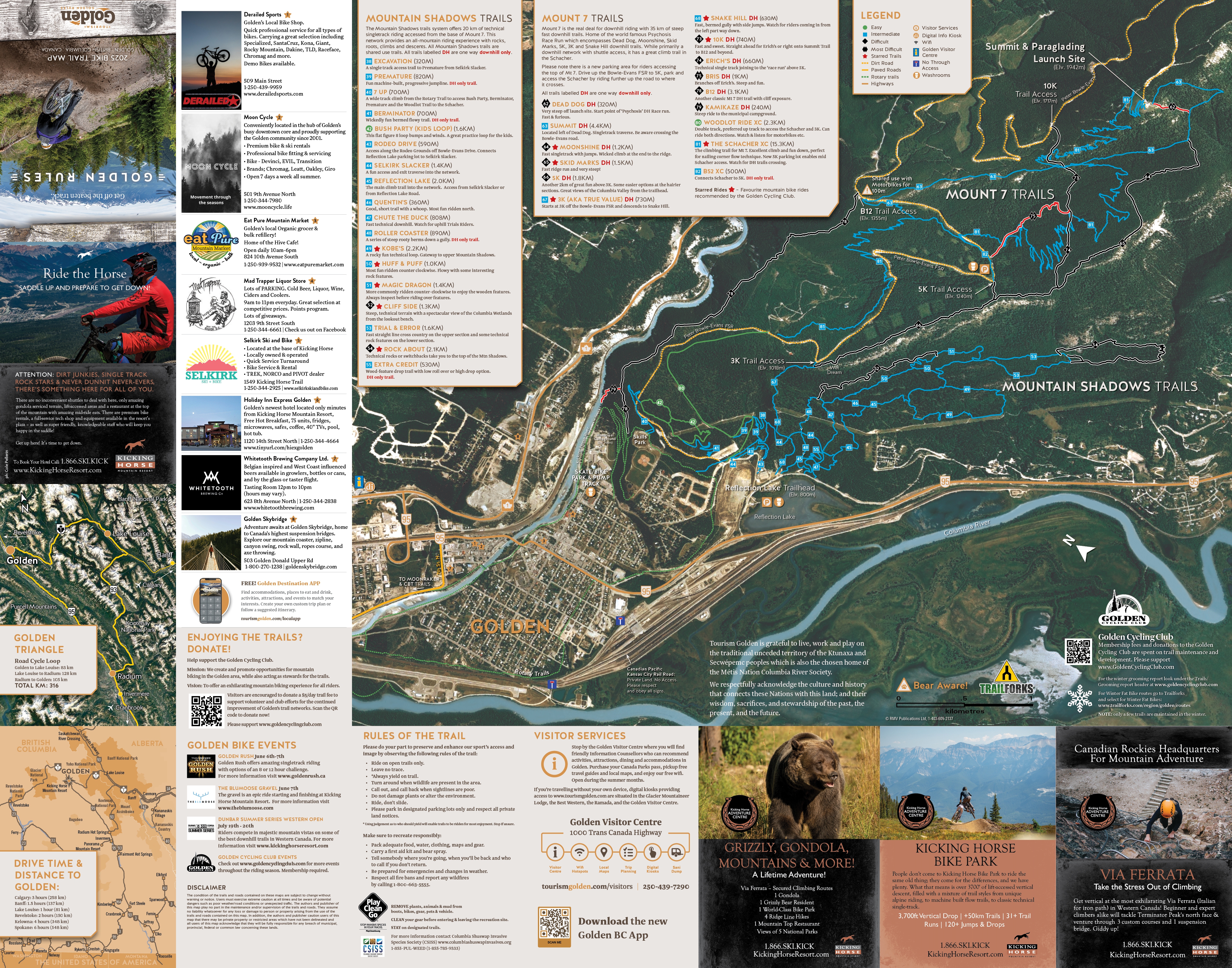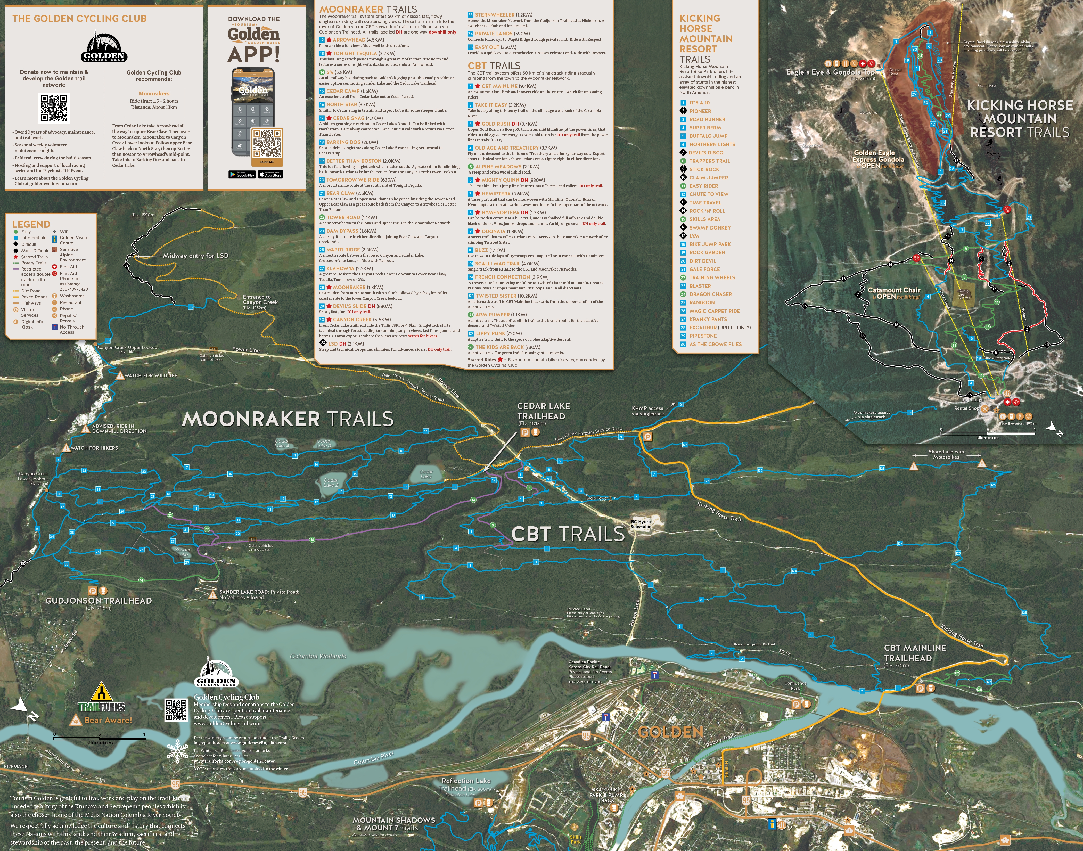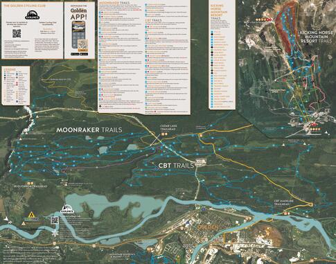 The Golden Bike Trail Map is your guide to over 129 km of cross-country trails in the Moonraker, CBT, and Mountain Shadows trail systems, as well as the Mount 7 downhill trails and Kicking Horse Bike Park.
