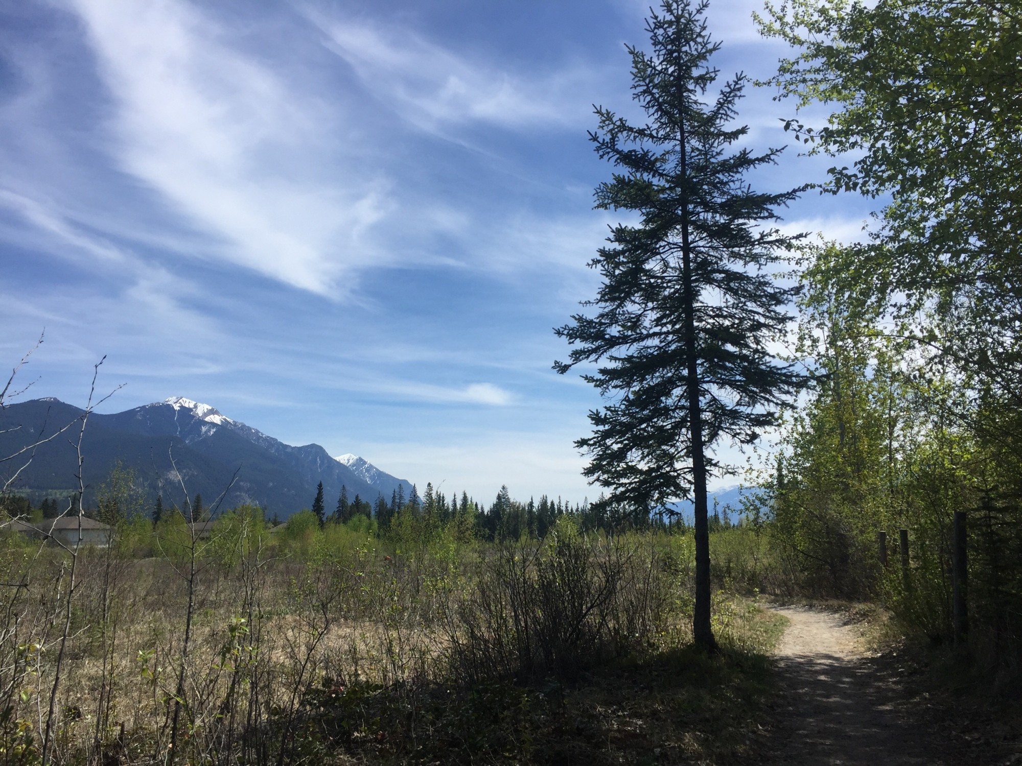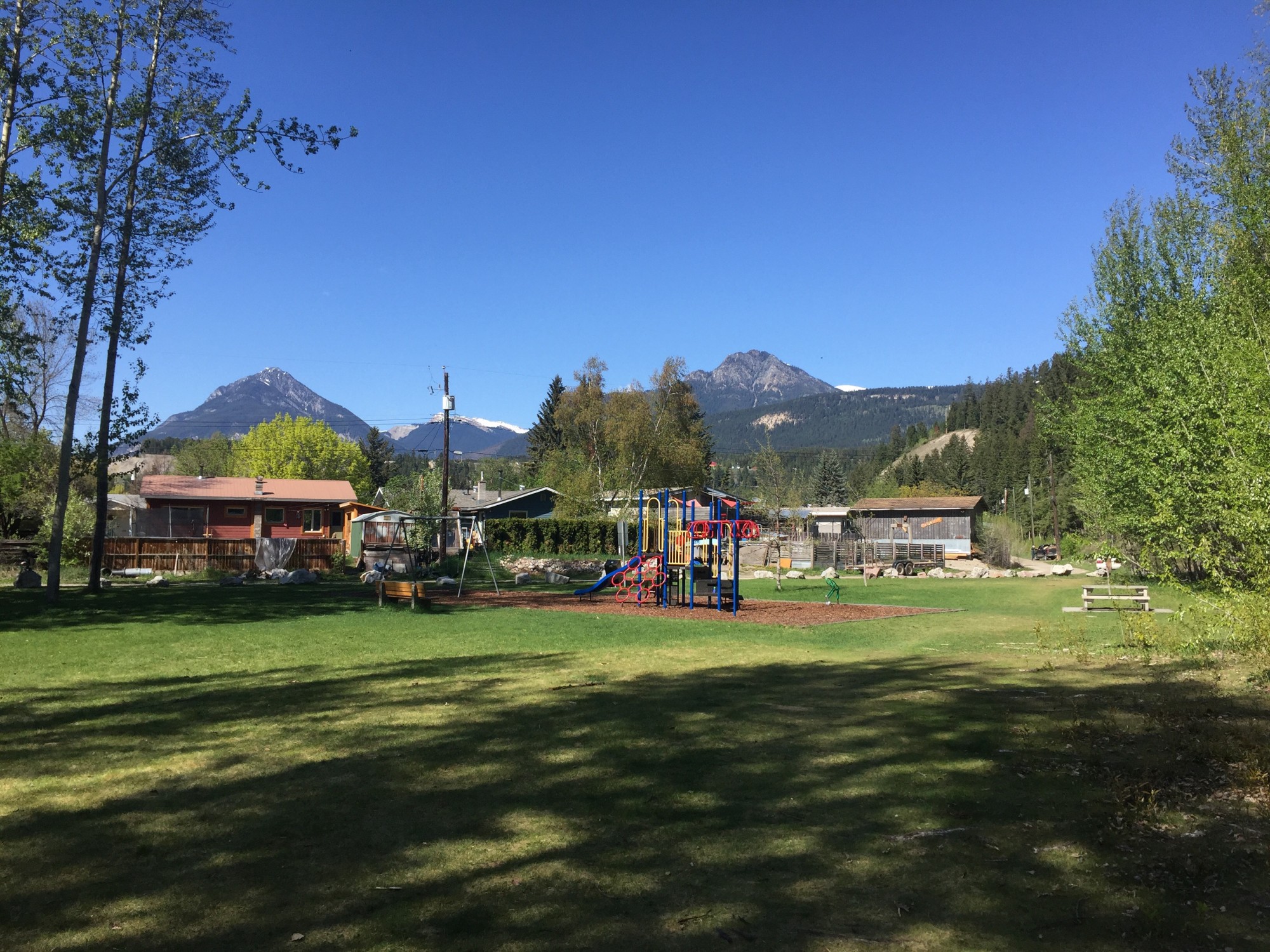 Your adventure has only just begun, retrace your steps back over the train tracks and seek the path on the right side of the road where the gravel path begins. This trail will eventually turn south and meander gently through fields and wooded areas eventually leading to a clearing and over to 14th Street. Heading East, Mount 7 will be directly in front of you. This prominent peak is the launching point for paragliders and hang gliders, the starting point for the several downhill bike trails and one of the most scenic viewpoints you’ll ever find. Follow 14th St., until you cross Highway 93/95 the trail continues on the other side. The Golden Museum isn’t far away,  drop in and check out local history, historical buildings and artifacts. Or continue right, passing the BC Hydro building and into Alexander Park Playground, another wonderful area where you can spend some time with the family playing on the jungle gym or relaxing in the shade. Continue through the park and into the back alley behind the houses. This wide trail seldom sees vehicles and is flanked by a steep treed hill, continuing until the gravel path starts again and crosses  Selkirk drive and continues past Alexander Park Elementary School.