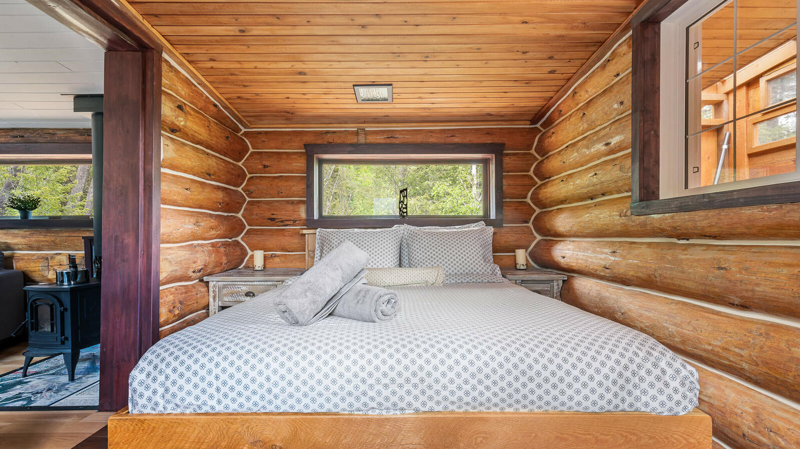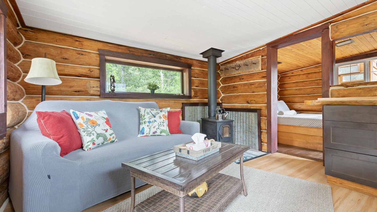 小木屋内部舒适惬意,配有一张大号床和可拉出的沙发,最多可容纳 4 人。小木屋内有一个烧烤架,一个用于冷藏的冰盒,还有一个带自来水的全套浴室,在气温超过零度时仍可使用。在冬季,您可以用木柴炉取暖,还可以使用屋外不远处干净整洁、充满树林气息的外屋。