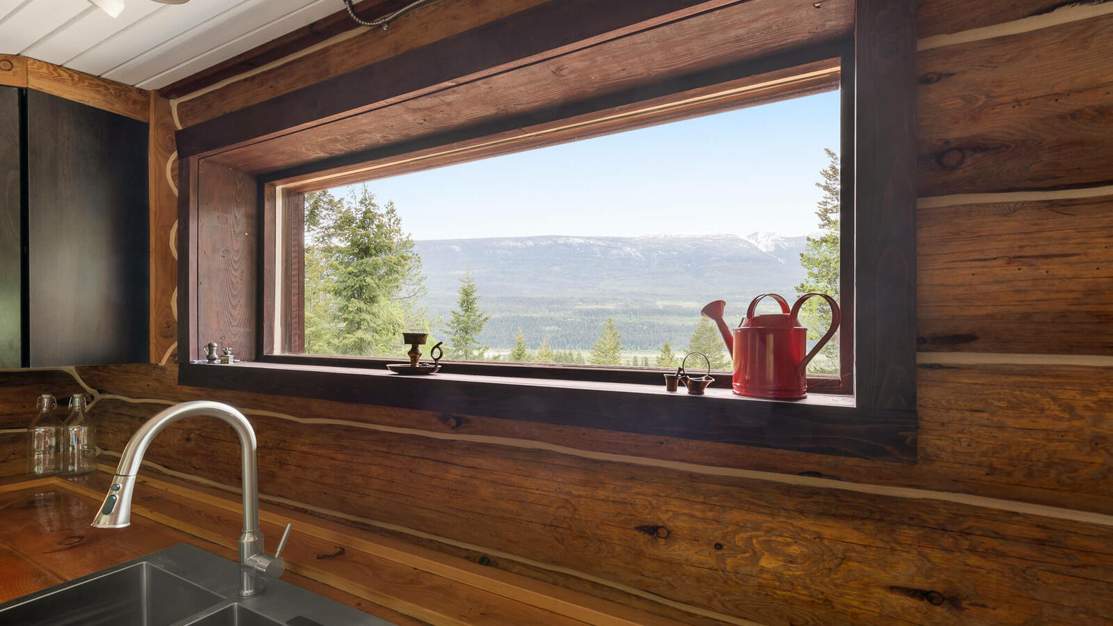 这座独特的三季离网木屋位于 CWO 农场冷杉林的山脊线上。环绕式露台可将迷人的景色尽收眼底。